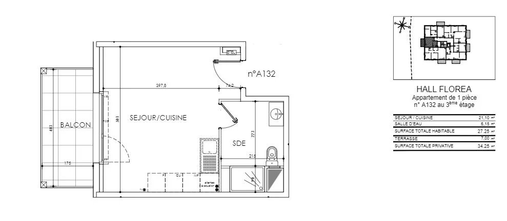 Appartement T1 de 27.25 m2 comprenant séjour avec coin cuisine, salle d'eau-wc, une terrasse de 7 m2